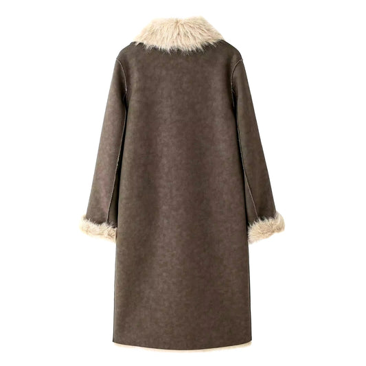Moderner Mantel mit Kunstfellbesatz in Braun