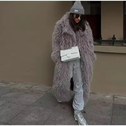Eleganter grauer Kunstpelzmantel mit Kapuze