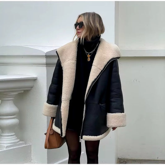 Oversize-Lederjacke mit Shearling-Futter