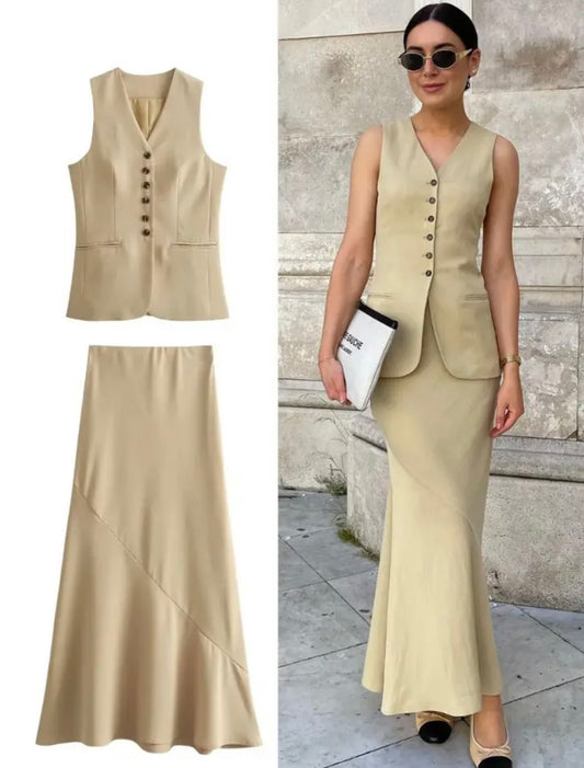 Two-piece women's outfit with vest and skirt in beige