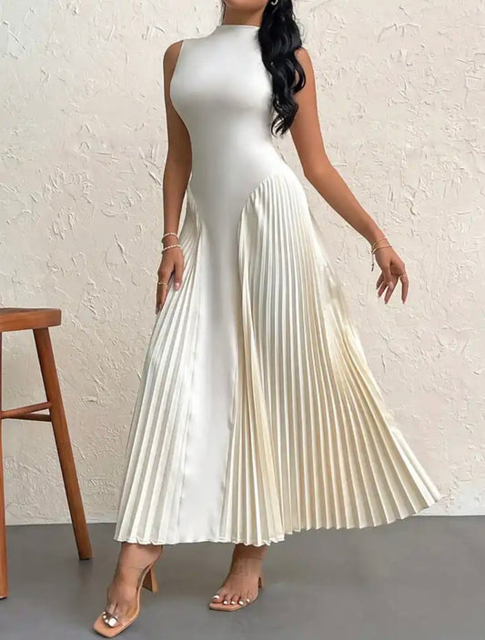 Sleeveless maxi dress with pleated details in cream
