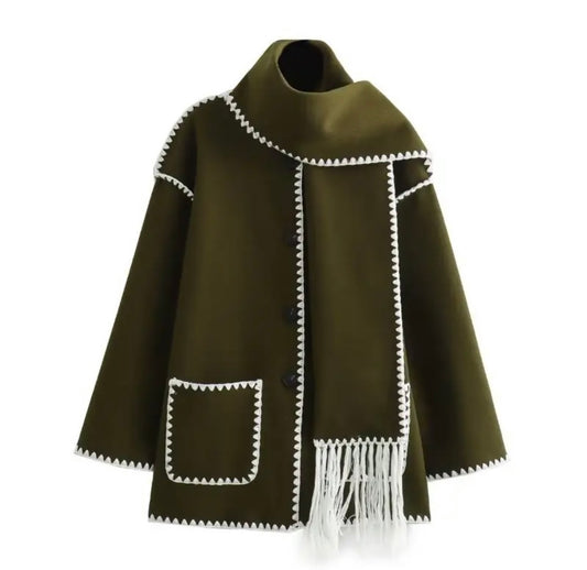 Elegant coat with black trim and fringe detail