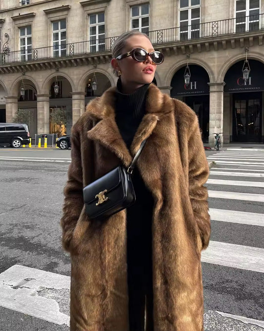 Luxurious women's faux fur coat in brown