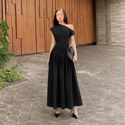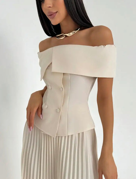 Elegant off-shoulder maxi dress with pleated skirt in cream