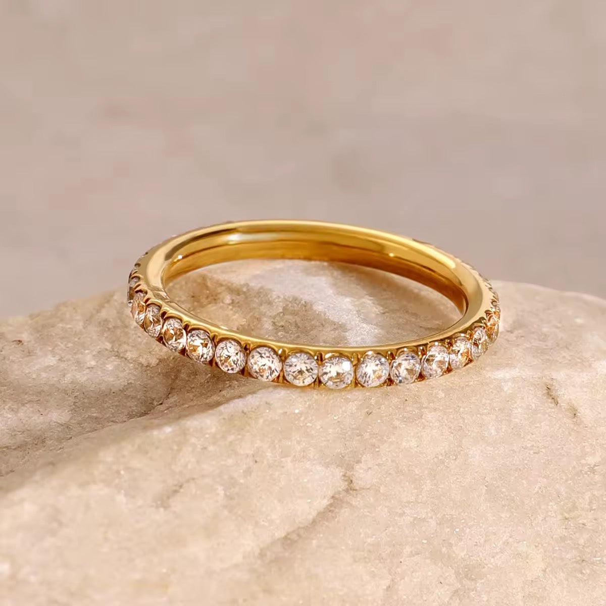 Cette bague exquise en or 18 carats de haute qualité et étanche est sertie de diamants étincelants dans un sertissage pavé en filigrane. Grâce à ses propriétés imperméables, il conserve sa brillance et sa qualité même lorsqu'il est porté quotidiennement, même lorsque vous vous lavez les mains ou prenez une douche.