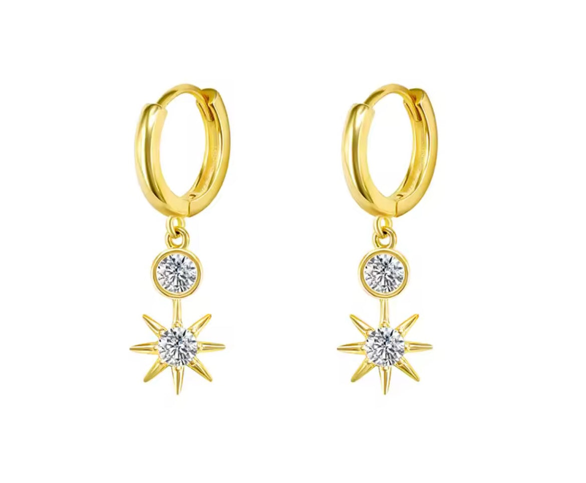Diese eleganten Celestial Star Hoops vereinen zeitlose Creolen mit einem funkelnden Stern-Design. Die zarten Zirkonia-Steine sorgen für einen edlen Glanz und machen die Ohrringe zu einem echten Hingucker – perfekt für Alltag und besondere Anlässe.
